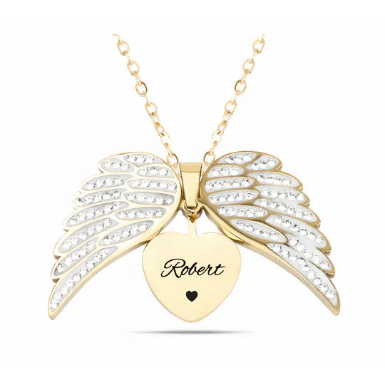 In the center of the delicately sculpted wings, adorned with sparkling crystals, the heart-shaped pendant is customizable with the name or message of your choice. This unique engraving transforms the jewelry into a deeply personal and intimate tribute, designed to keep their presence close to you at all times.
